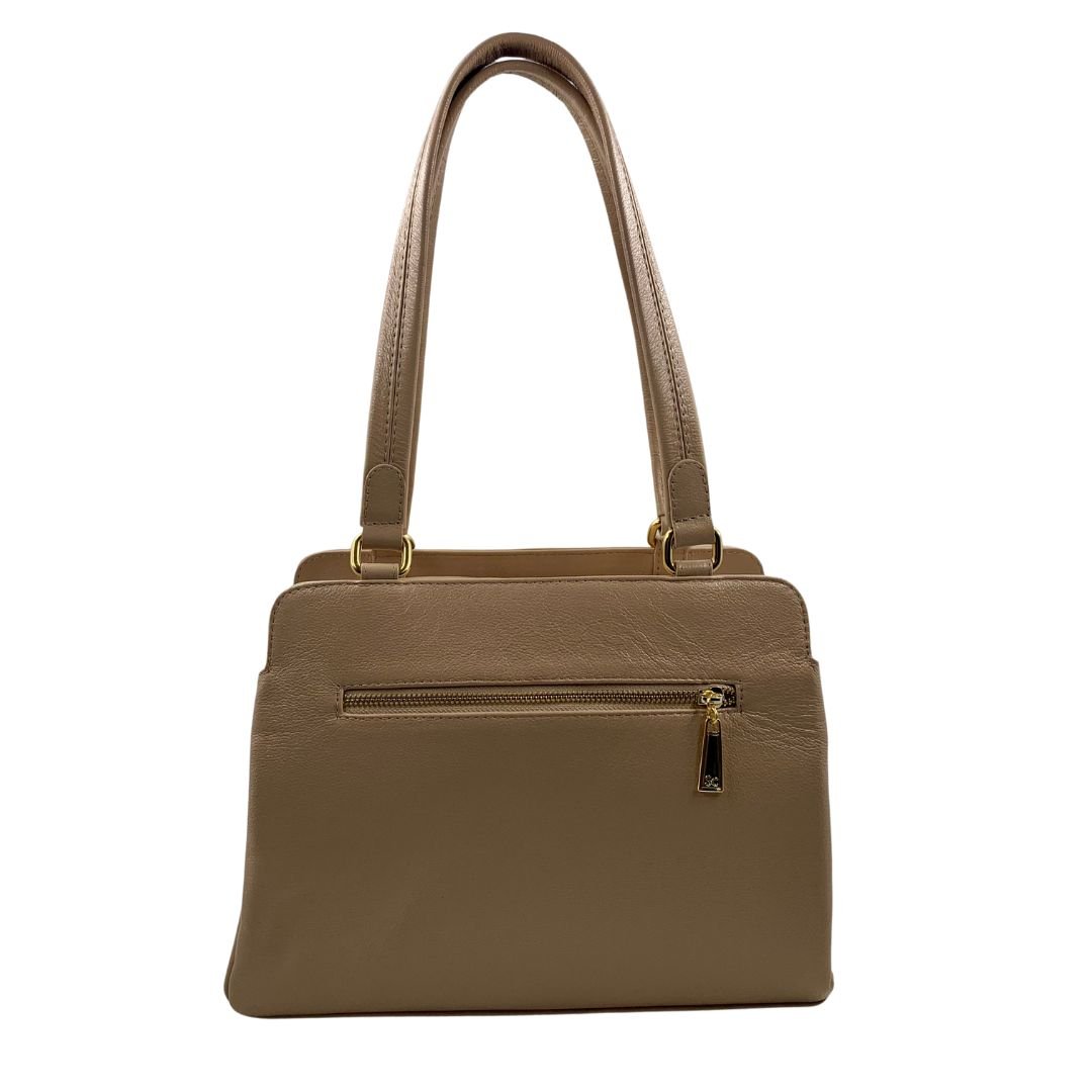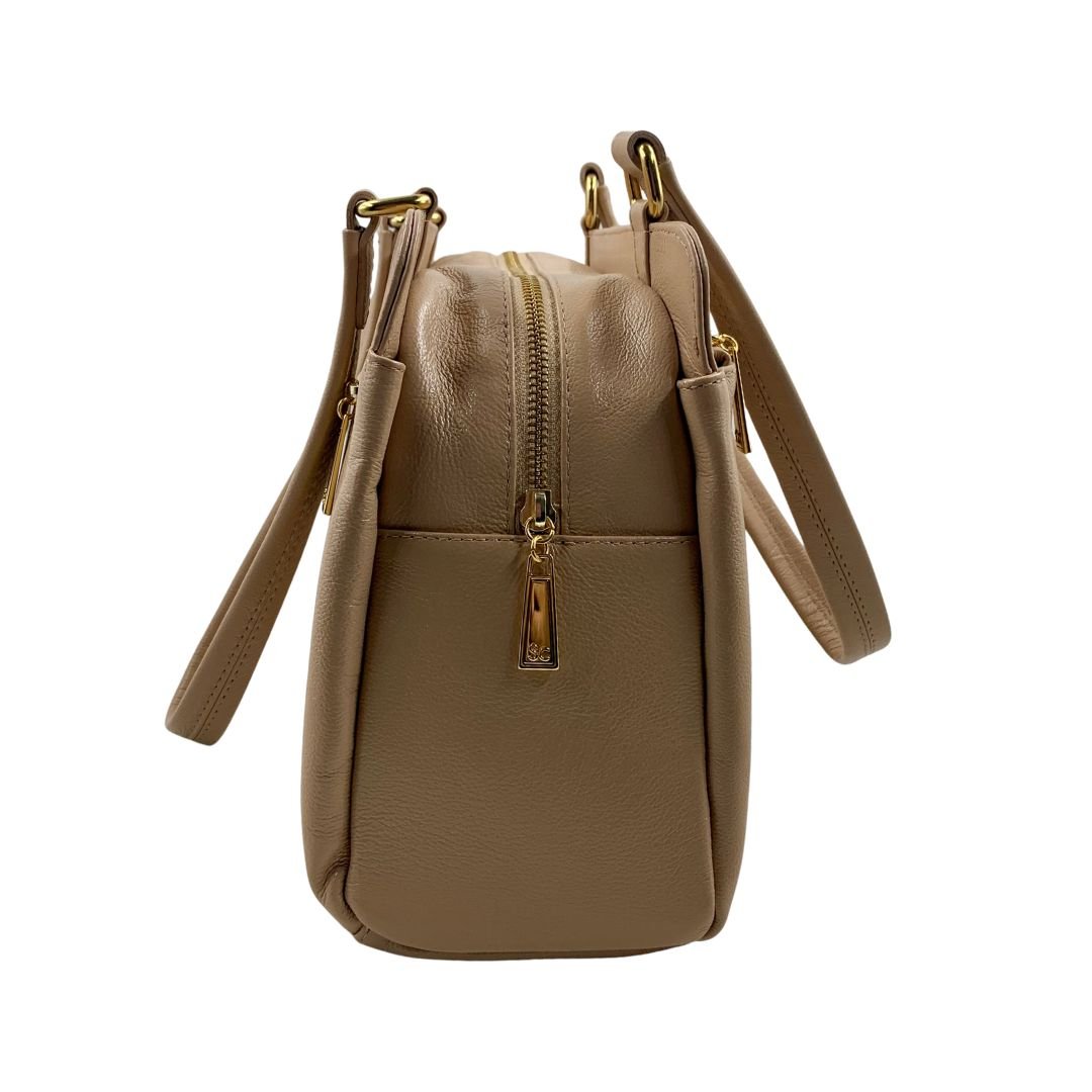 Bolsa de Ombro Scamboo Couro Bege 1973. A bolsa é um item essencial na vida da mulher, variando o tamanho das pequenas as grandes. Confeccionada em couro, possui uma abertura principal com fechamento em zíper, com bolsos auxiliares no seu interior, com dois bolsos, um frontal e outro na parte de traz com fechamento em zíper, com alça auxiliar. Sua estrutura firme e o tom neutro permitem composições versáteis para o dia a dia, do escritório aos compromissos sociais. Um modelo funcional, pensado para acompanhar a rotina com estilo e praticidade.
