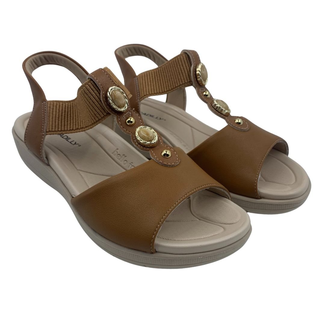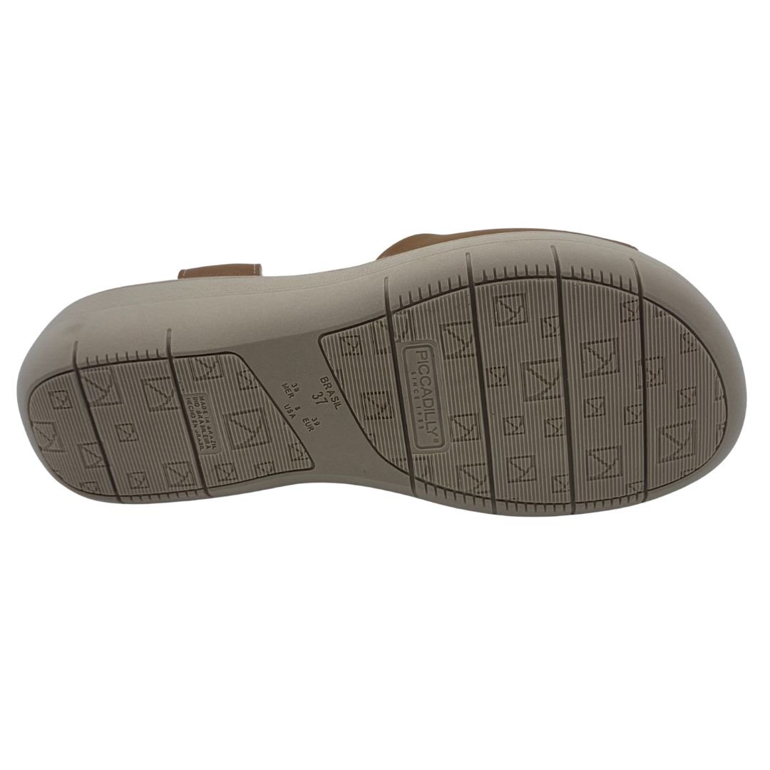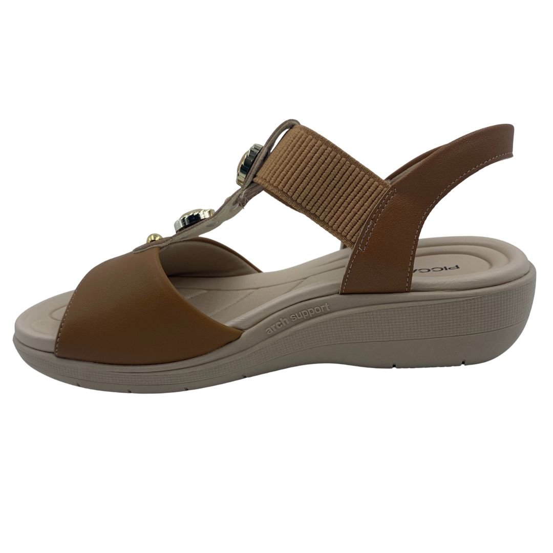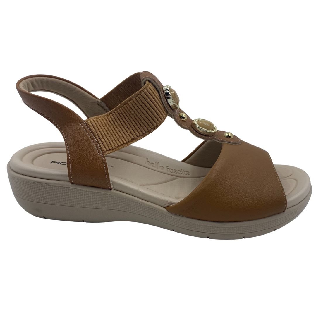 Sandália Anabela Fascite Plantar Piccadilly Marrom 239033. Sandália ideal para quem sofre com fascite plantar, pois previne as dores causadas pela inflamação da fáscia plantar, neutralizando a pisada, com a ajuda de um suporte para o arco do pé. Tem palmilha extra macia e anatômica que acomoda o pé, absorve impactos e previne dores no calcanhar, sua sola fabricada em borracha antiderrapante traz estabilidade e segurança ao caminhar. Fabricada em napa sintética macia, também se adapta bem para quem sofre com o temido Joanete, pois se molda ao formato dos pés, seu calce fácil em elástico, traz comodidade e praticidade na hora do calce, seu charme fica por conta dos detalhes dourados e pedrarias. Compre agora, e sinta o conforto que só uma Piccadilly tem.
