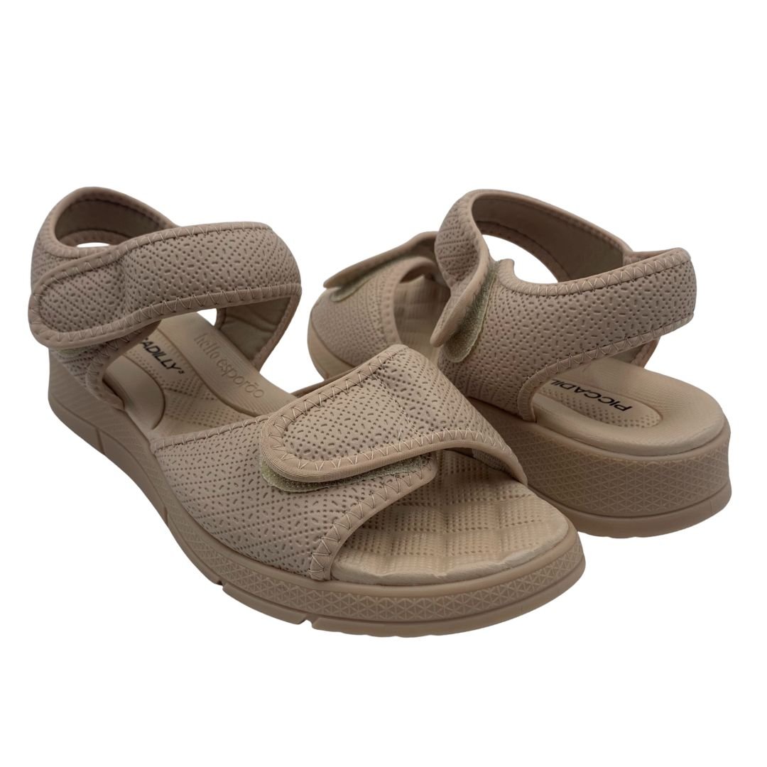 Sandália Anabela Hello Esporão Piccadilly Nude 571003. Modelo pensando para quem sofre com o temido Esporão, possui palmilha anatômica com contorno especial que previne a pressão na região central do calcanhar, prevenindo as dores causadas pelo esporão de calcâneo, distribuindo a pressão plantar de forma uniforme e amortece o impacto na área inflamada. Com sistema calce fácil com superfície alto colante, garantindo praticidade e conforto para o dia a dia, fabricada em napa sintética macia, também se adapta bem para quem sofre com o temido Joanete, pois se molda ao formato dos pés. Compre agora, e sinta o conforto que só uma Piccadilly tem.