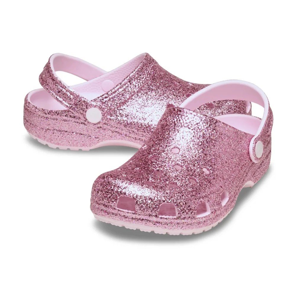 Sandália Crocs Original Infantil Chunky Glitter Rosa 21194. Se o seu pequeno não se cansa de glitter na rotina diária, estes clogs grandes e brilhantes serão o complemento perfeito para as suas roupas. Um par de meias coloridas só aumentará a fofura e lhe renderá elogios na escola, em eventos de fim de ano e em passeios em família. Brilhe! Outro diferencial do modelo, é a tecnologia Croslite, desenvolvida para proporcionar excelente absorção de impactos e amortecimento. Não fique sem, compre logo seu Crocs Original.