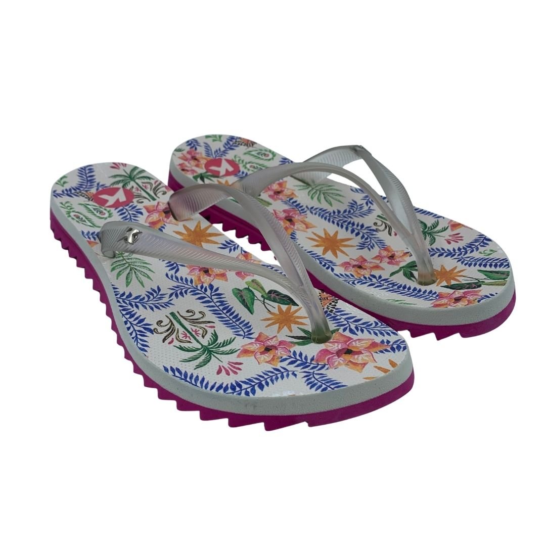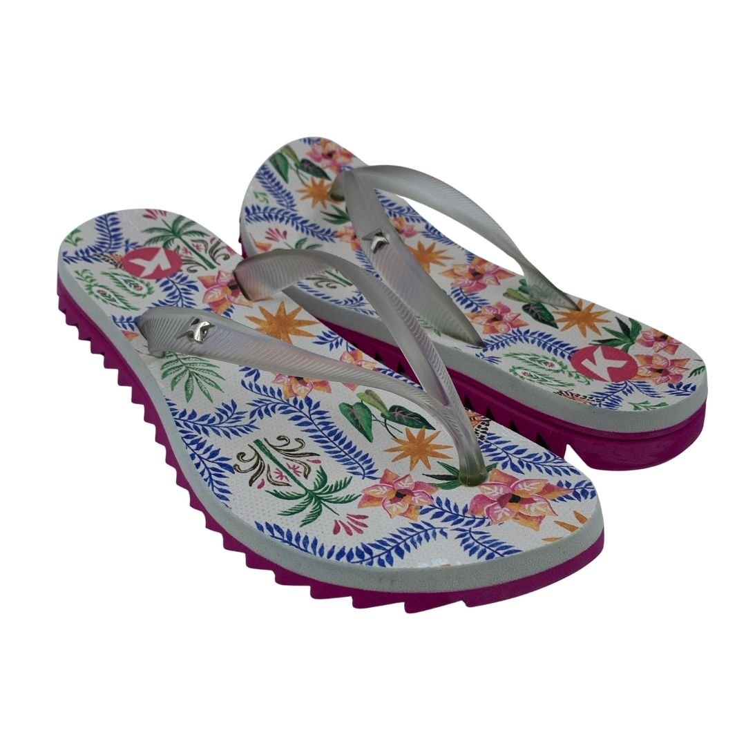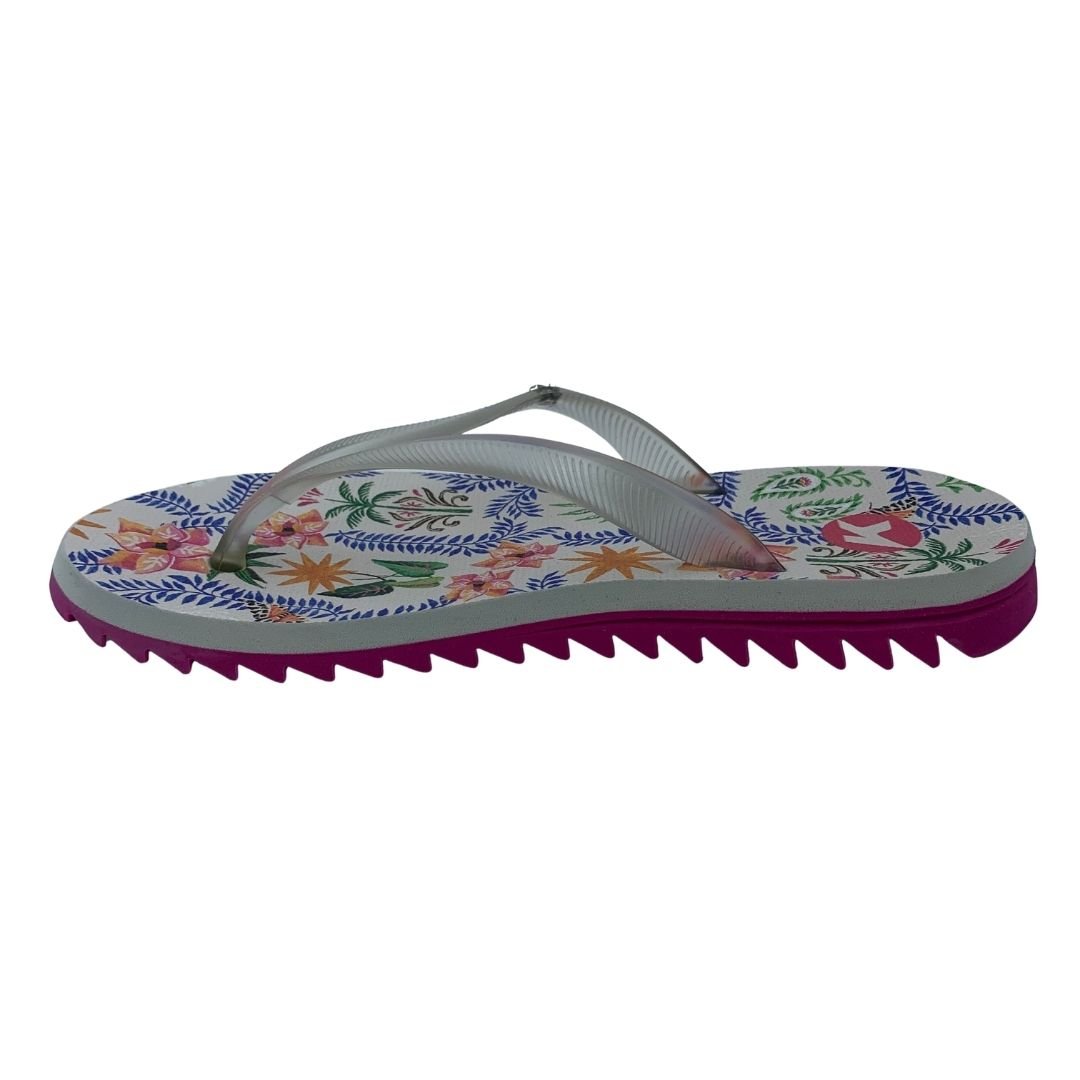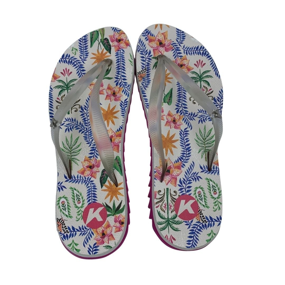 Sandália Feminina Kenner Ibiza Pro Flores Rosa e Bege. Perfeita para quem não dispensa estilo e conforto, sua tira slim em gel maleável trás delicadeza, juntamente com seu identificador K metálico em níquel escovado. Palmilha de EVA expandido com textura pontos, a deixa mais confortável, solado tratorado de borracha vulcanizada que garante aderência e estabilidade durante seu uso. Sua estampa moderna e feminina são a cara do verão, perfeita para você curtir os dias de calor. Sinta o conforto e a tecnologia nas sandálias Kenner. Kenner redefina-se!