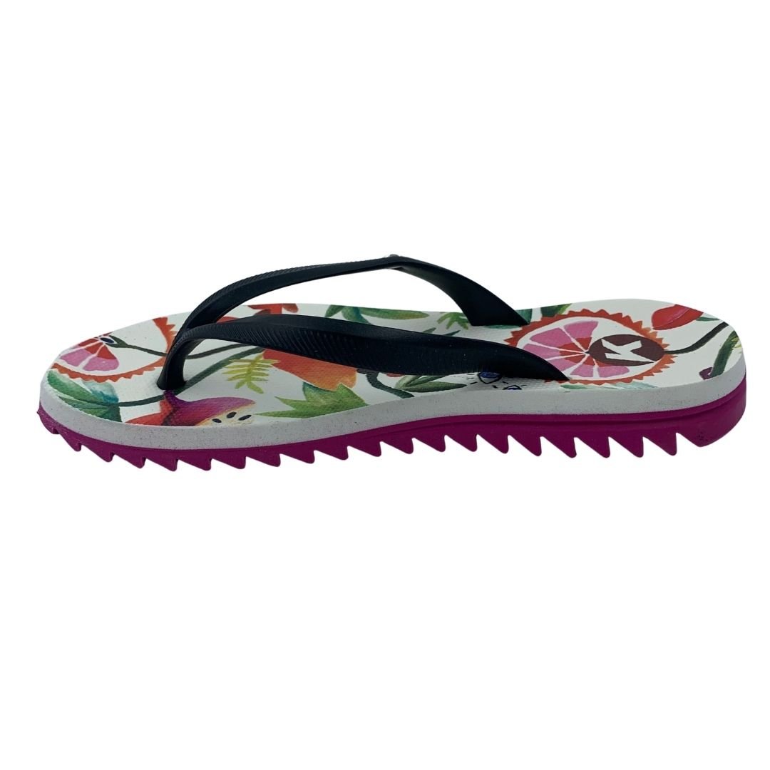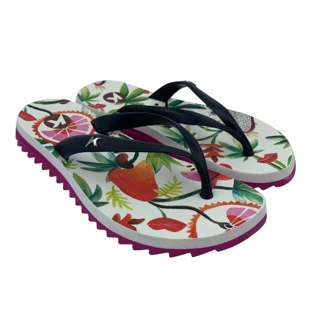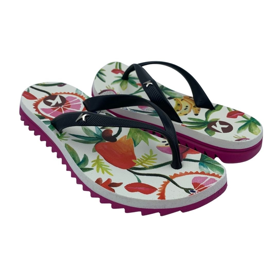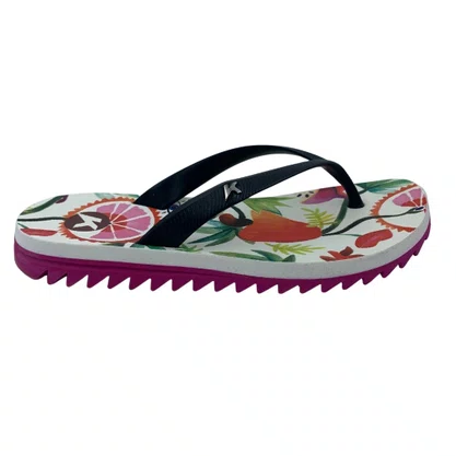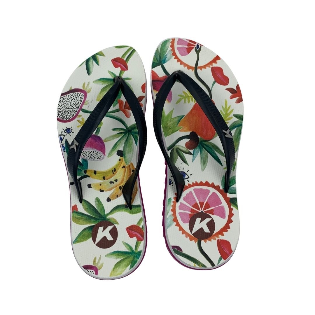 Sandália Feminina Kenner Ibiza Pro Frutas Preta. Perfeita para quem não dispensa estilo e conforto, sua tira slim em gel maleável trás delicadeza, juntamente com seu identificador K metálico em níquel escovado. Palmilha de EVA expandido com textura pontos, a deixa mais confortável, solado tratorado de borracha vulcanizada que garante aderência e estabilidade durante seu uso. Sua estampa moderna e feminina são a cara do verão, perfeita para você curtir os dias de calor. Sinta o conforto e a tecnologia nas sandálias Kenner. Kenner redefina-se!
