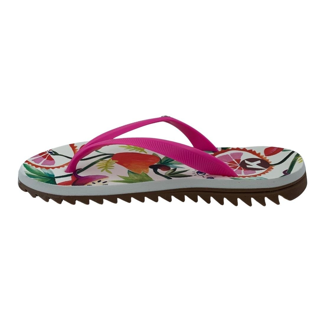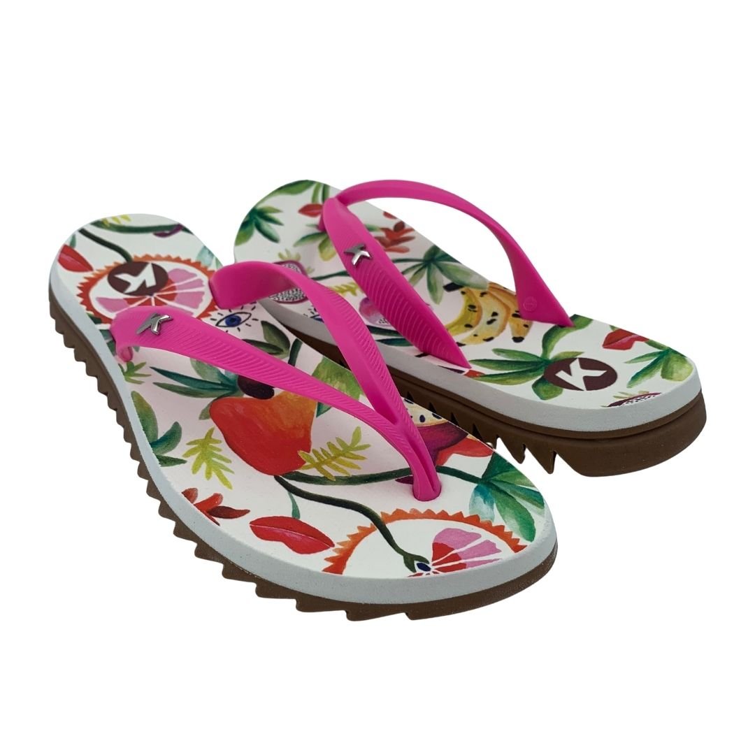 Sandália Feminina Kenner Ibiza Pro Frutas Rosa. Perfeita para quem não dispensa estilo e conforto, sua tira slim em gel maleável trás delicadeza, juntamente com seu identificador K metálico em níquel escovado. Palmilha de EVA expandido com textura pontos, a deixa mais confortável, solado tratorado de borracha vulcanizada que garante aderência e estabilidade durante seu uso. Sua estampa moderna e feminina são a cara do verão, perfeita para você curtir os dias de calor. Sinta o conforto e a tecnologia nas sandálias Kenner. Kenner redefina-se!