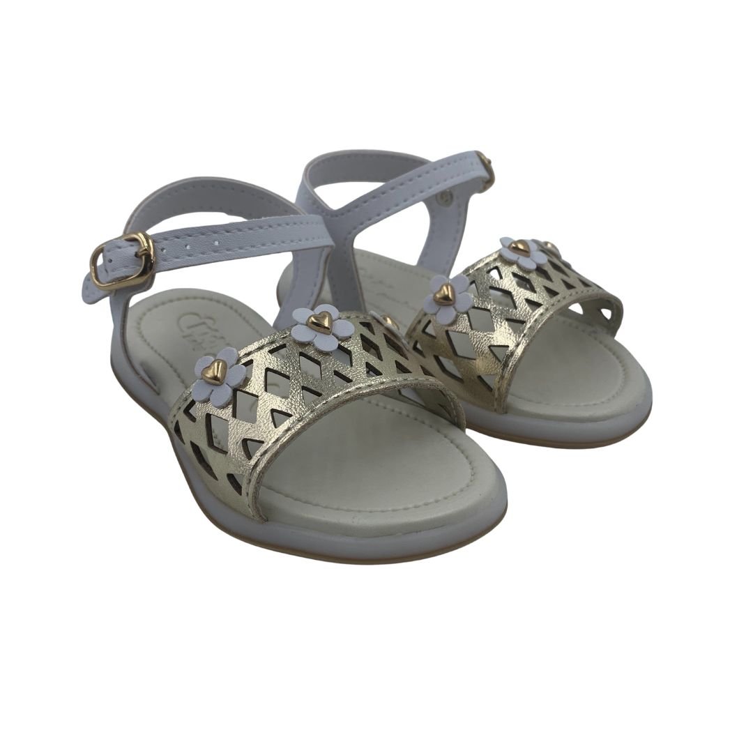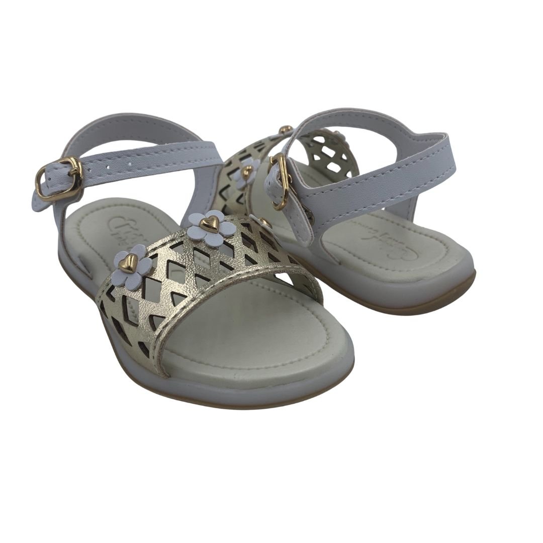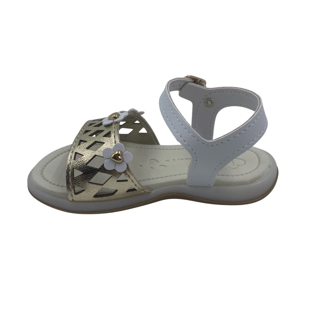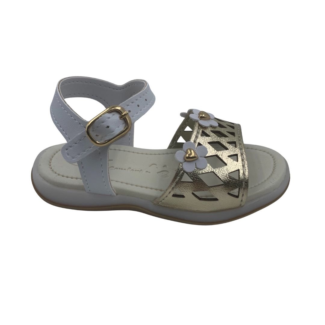 Sandália Menina Bebê Anatômica Kidy Branca com Dourada 12043. Uma sandália divertida e atemporal, perfeita para compor os mais variados looks. Seu solado anatômico possui a tecnologia equilíbrio, ideal para os primeiros passos, pois garante estabilidade e segurança ao caminhar. Fabricada em napa sintética, possui detalhes em seu cabedal em cortes a laser, e flores fixada com um coração, possui fechamento em fivela e palmilha em EVA, garantindo o máximo conforto para os primeiros passos. Kidy saúde e conforto para os pés do seu bebê, compre logo.