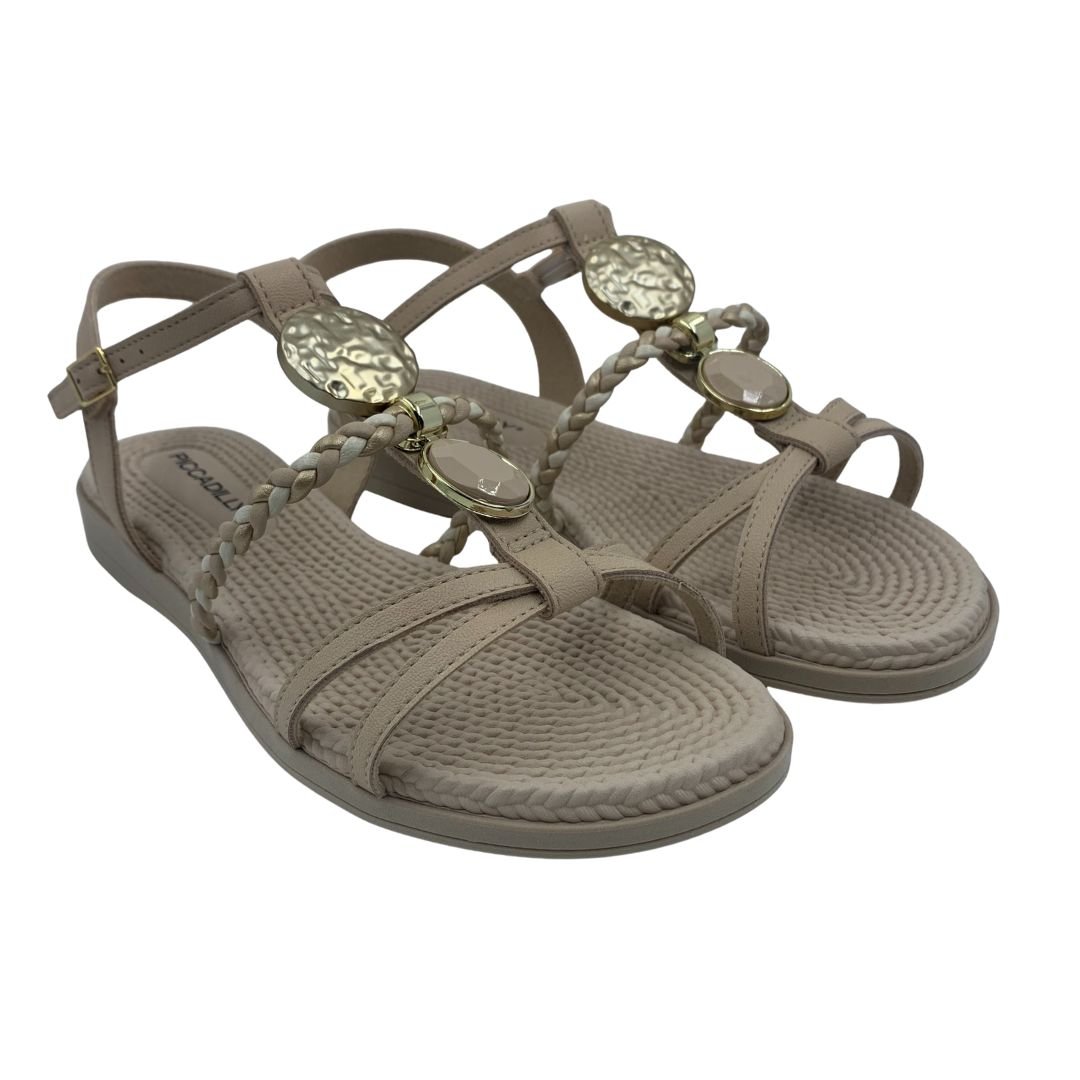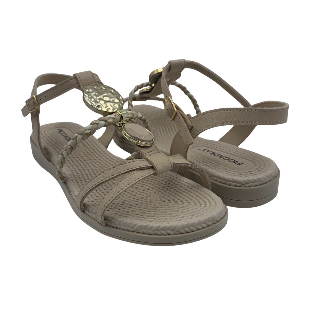 Sandália Rasteira Conforto Piccadilly Nude 513040. O conforto que você procura para seu trabalho ou para momentos de lazer. Sua palmilha em EVA garante o calce perfeito, trazendo conforto, amortecimento e leveza à sandália, sua sola em borracha antiderrapante dá estabilidade e segurança ao caminhar. Suas tiras confeccionadas em napa sintética garantem qualidade, suas tiras finas são a cara do verão, sendo uma delas trançada dando delicadeza, juntamente com seu enfeite dourado e pedra. Compre agora, e sinta o conforto que só uma Piccadilly tem.