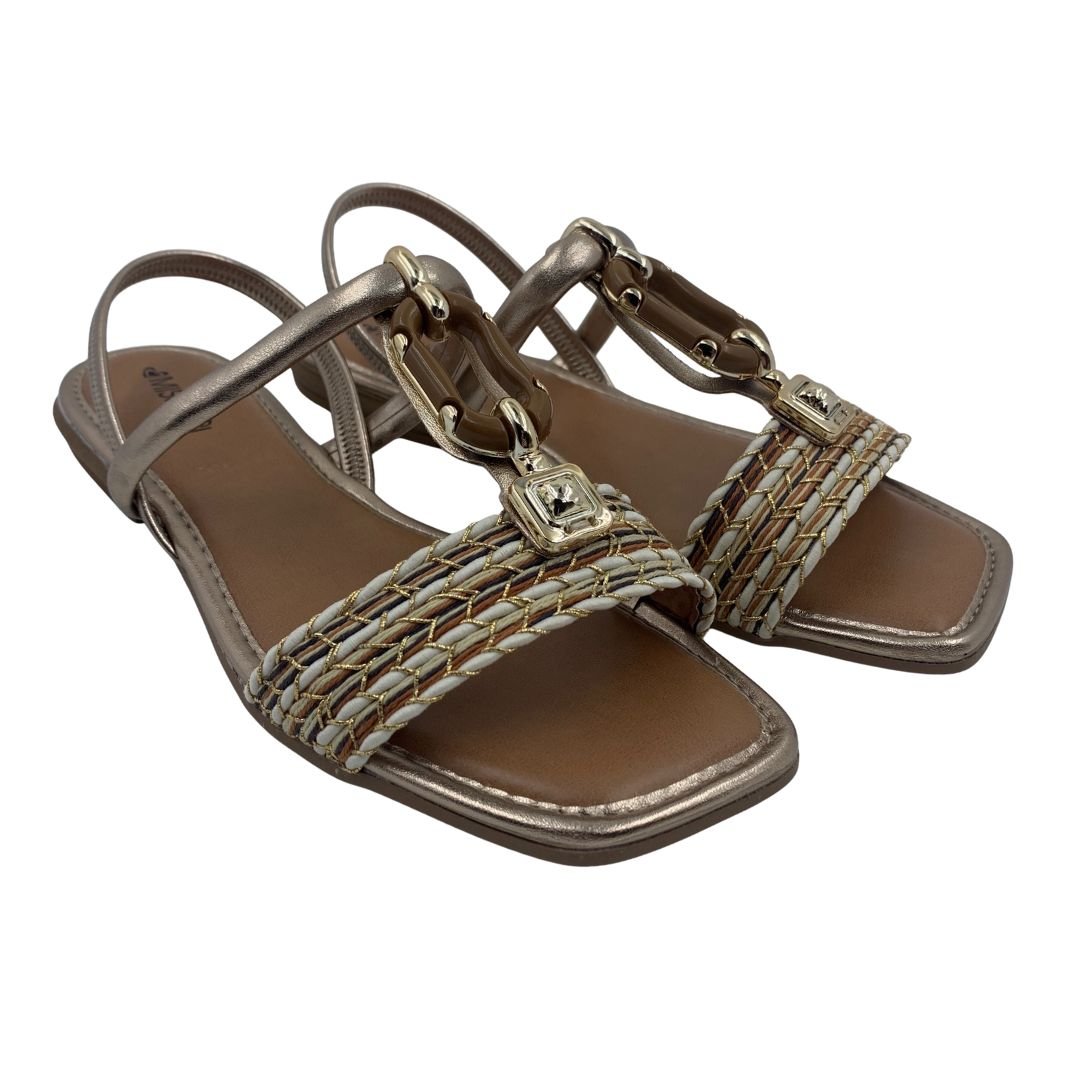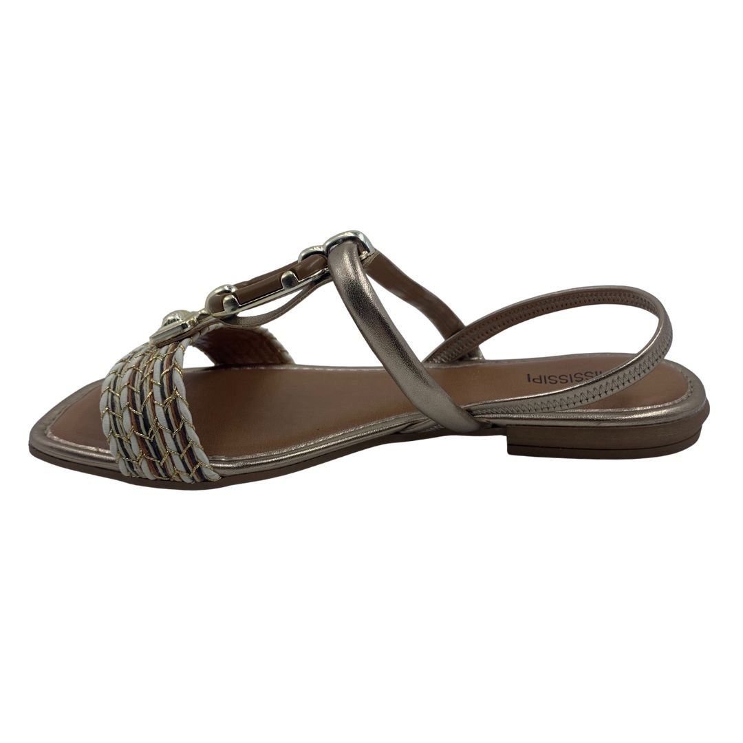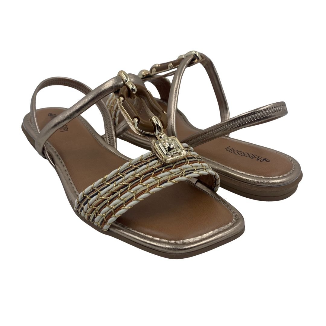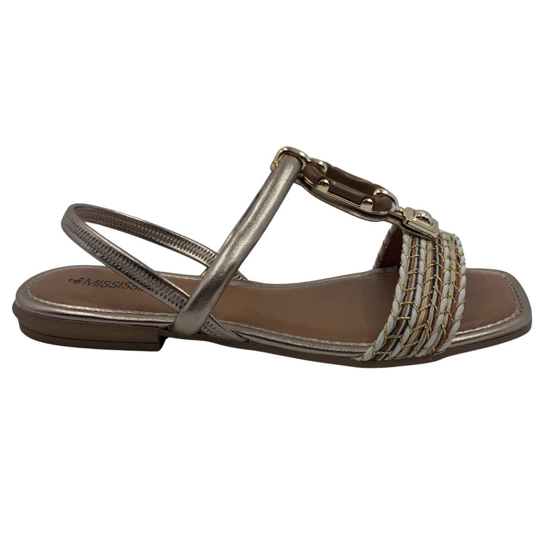 Sandália Rasteira Mississipi Calce Fácil Metalizada 302. O modelo que não pode faltar na sapateira feminina, a sandália rasteira é uma peça atemporal e versátil, podendo ser usada com qualquer estilo de roupa, seus modelos vão desde os mais simples aos mais sofisticados com aplicações em pedras e strass. Sua sola fabricada em borracha antiderrapante garante estabilidade a cada passo, seu cabedal em napa sintética possui enfeite dourado no cabedal no peito de pé, seu calce fácil traz praticidade e conforto na hora de vestir, sua palmilha estofada garante conforto. Mississipi Perfeita para você, compre logo a sua!