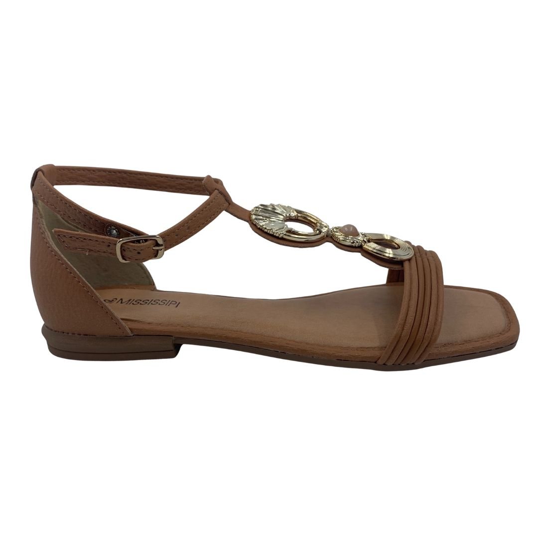 Sandália Rasteira Mississipi com Enfeite Bege 013. O modelo que não pode faltar na sapateira feminina, a sandália rasteira é uma peça atemporal e versátil, podendo ser usada com qualquer estilo de roupa, seus modelos vão desde os mais simples aos mais sofisticados com aplicações em pedras e strass. Sua sola fabricada em borracha antiderrapante garante estabilidade a cada passo, seu cabedal em napa sintética possui enfeite dourado no cabedal no peito de pé, com calcanhar fechado, possui fechamento em fivela. Mississipi Perfeita para você, compre logo a sua!