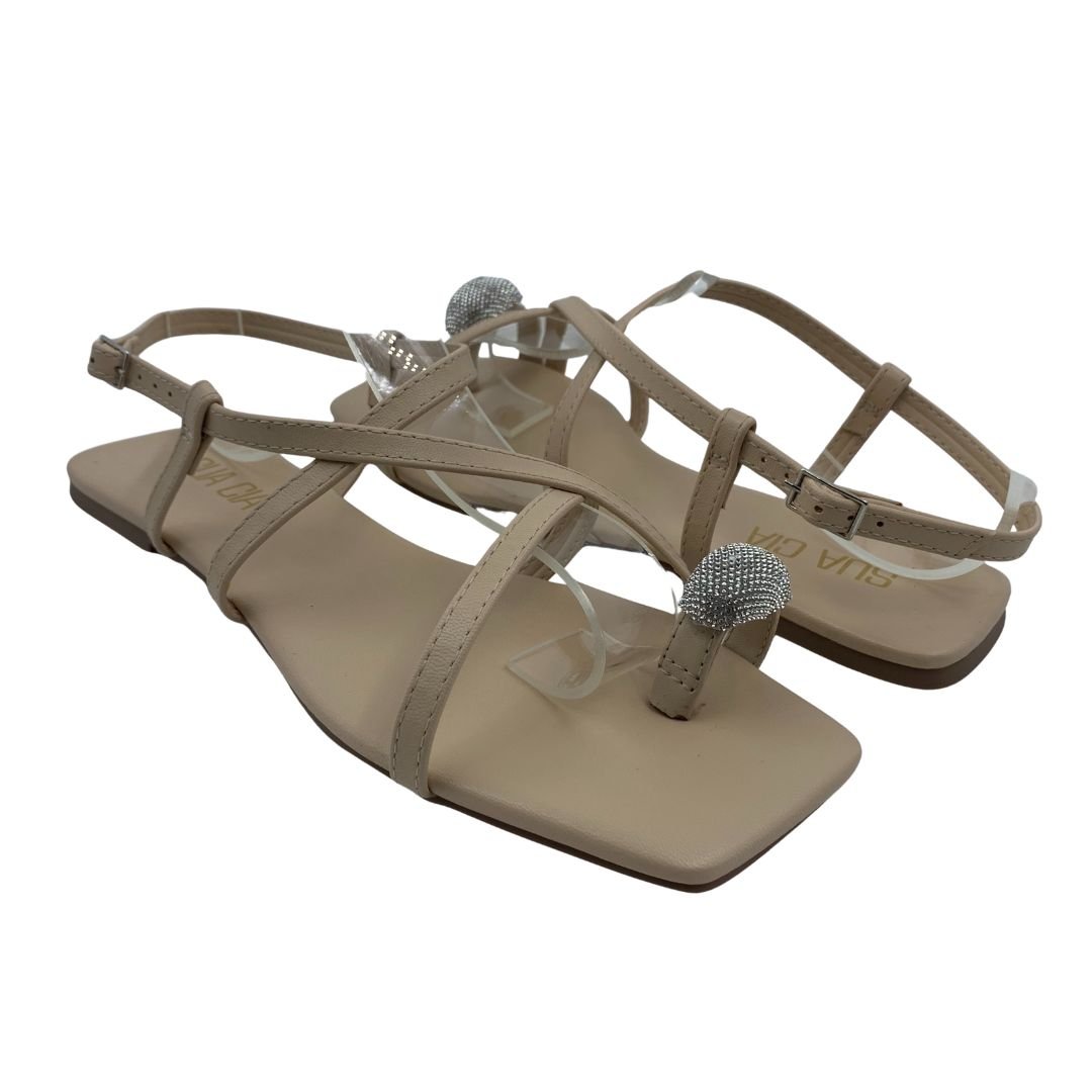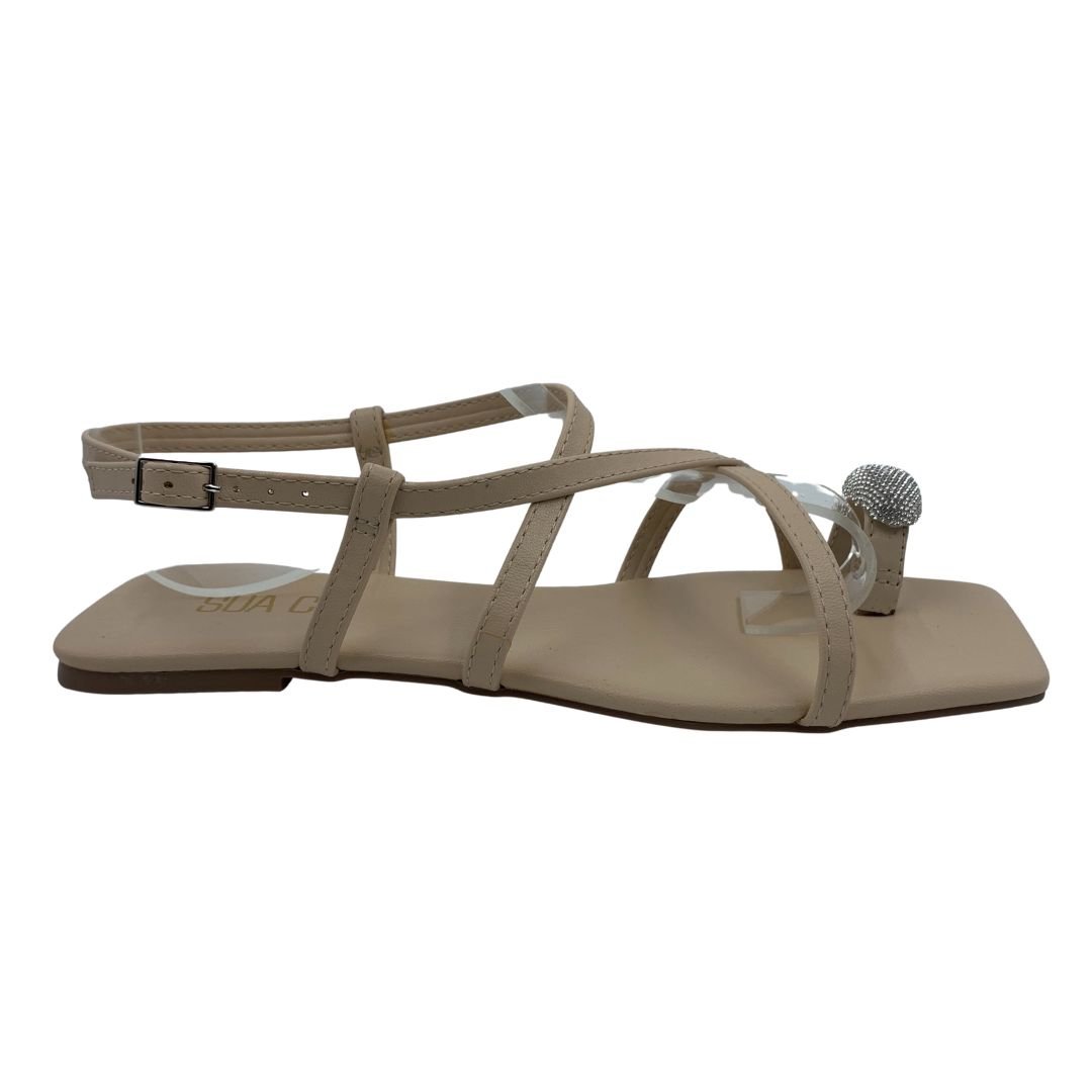 Sandália Rasteira Sua Cia com Strass Bege 16162. As sandálias rasteiras são a aposta certa para os dias mais quentes do verão, perfeita para usar com bermudas, saias e vestidos. Fabricada em napa sintética, suas tiras finas que envolvem os pés a deixam mais casual, com detalhe em strass no dedal a deixando mais delicada, sua palmilha estofada traz conforto. Sua sola fabricada em borracha antiderrapante garante estabilidade e segurança ao caminhar. Modernidade e conforto Sua Cia é a escolha ideal para você, compre já.