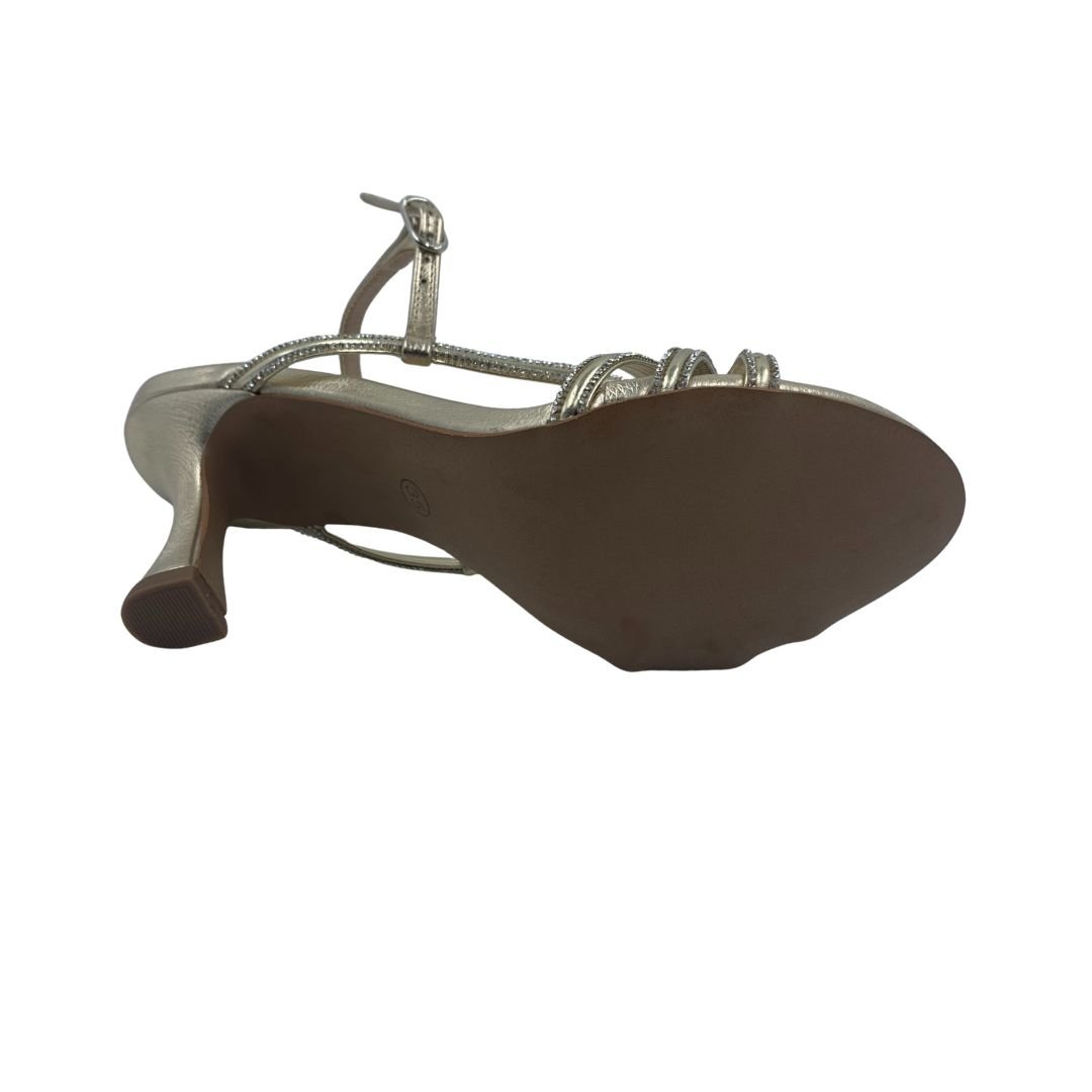 Sandália Social Salto Fino Jamar com Brilho Dourada 903419. Modelo clássico de salto fino, perfeito para usar em eventos trazendo sofisticação e elegância. Fabricada em napa sintética, possui tiras finas Strass dando um charme para sandália. Seu salto em cone de 7 cm, traz segurança ao caminhar, sua sola fabricada em borracha antiderrapante garante segurança e estabilidade ao caminhar. Compre logo a sua, e arrase no seu evento.