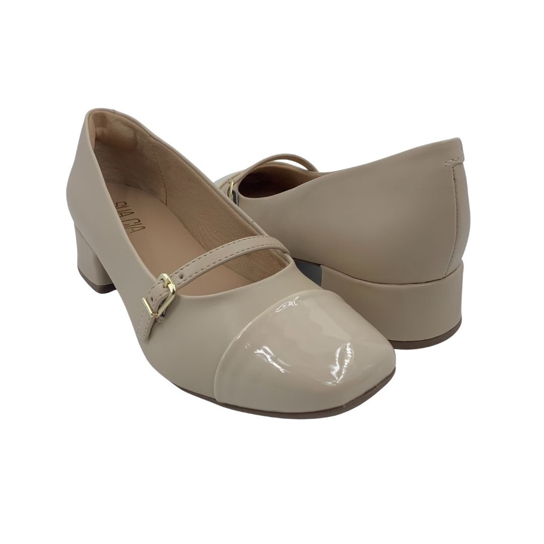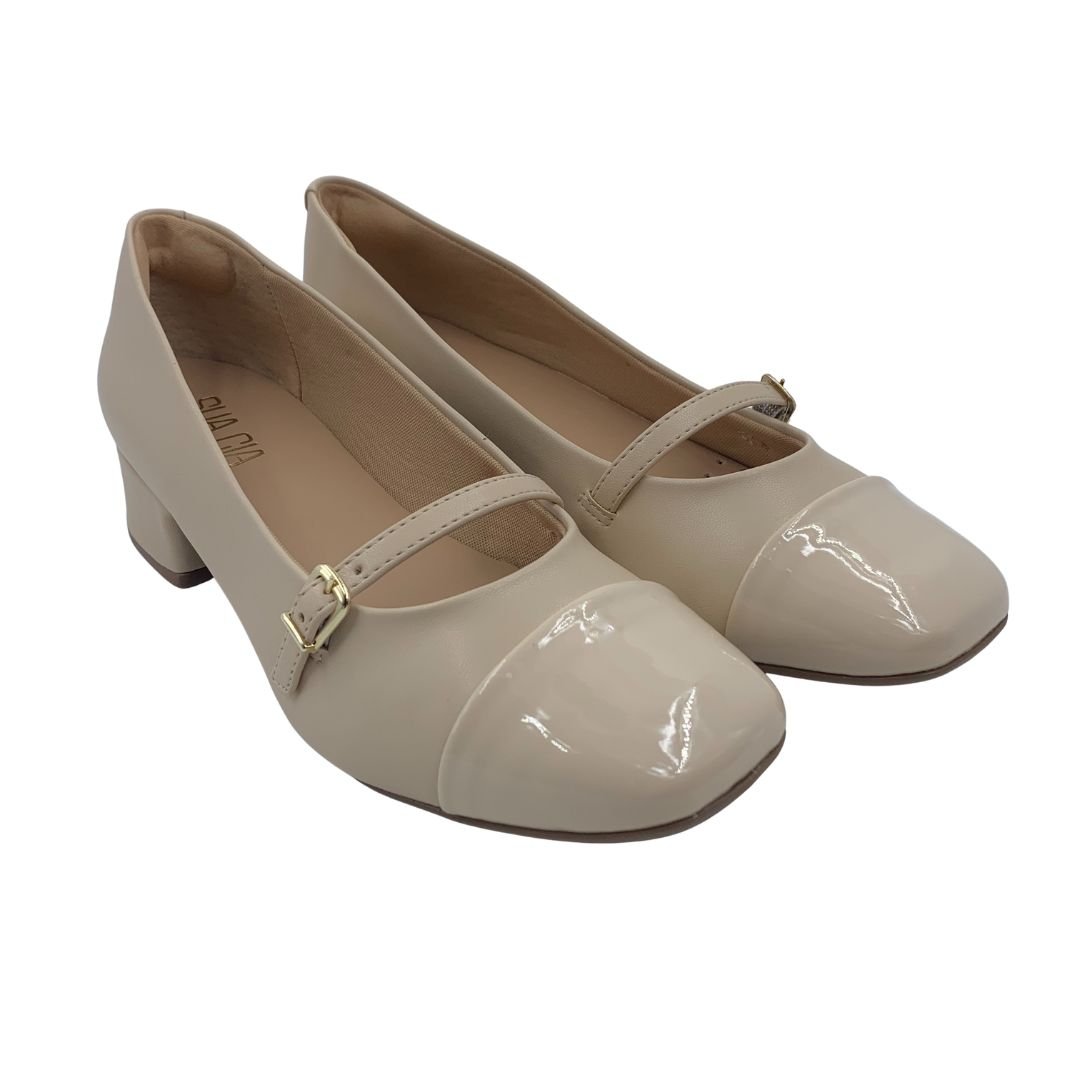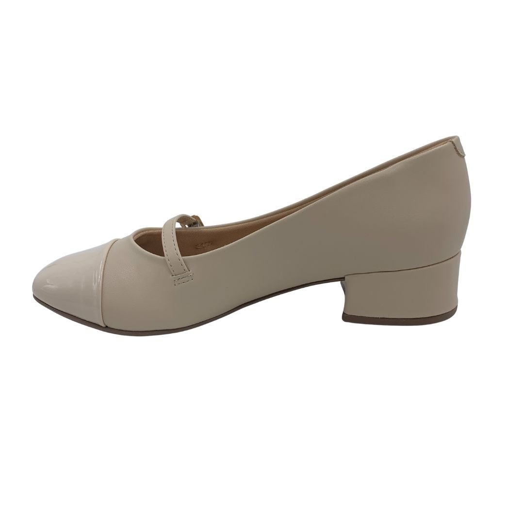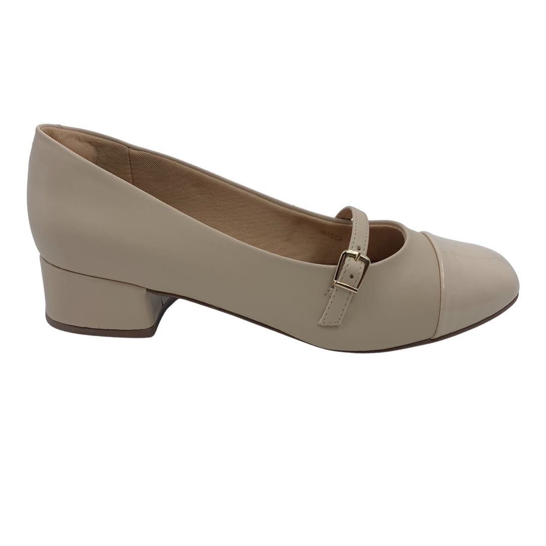 Sapato Sua Cia Casual Mary Jane Nude 15974. Os sapatos em salto bloco são peça chave na sapateira de toda mulher, podendo ser com salto alto ou baixo, são conhecidos pelo conforto e segurança que o formato do salto traz ao caminhar. Um sapato para você que procura algo prático e confortável para o dia a dia, ou para eventos, pois seu salto bloco de 4 cm, traz elegância e conforto na medida certa. Fabricado em napa sintética com detalhe de verniz no bico, possui forro estofado garantindo conforto. Modernidade e conforto Sua Cia é a escolha ideal para você, compre já.