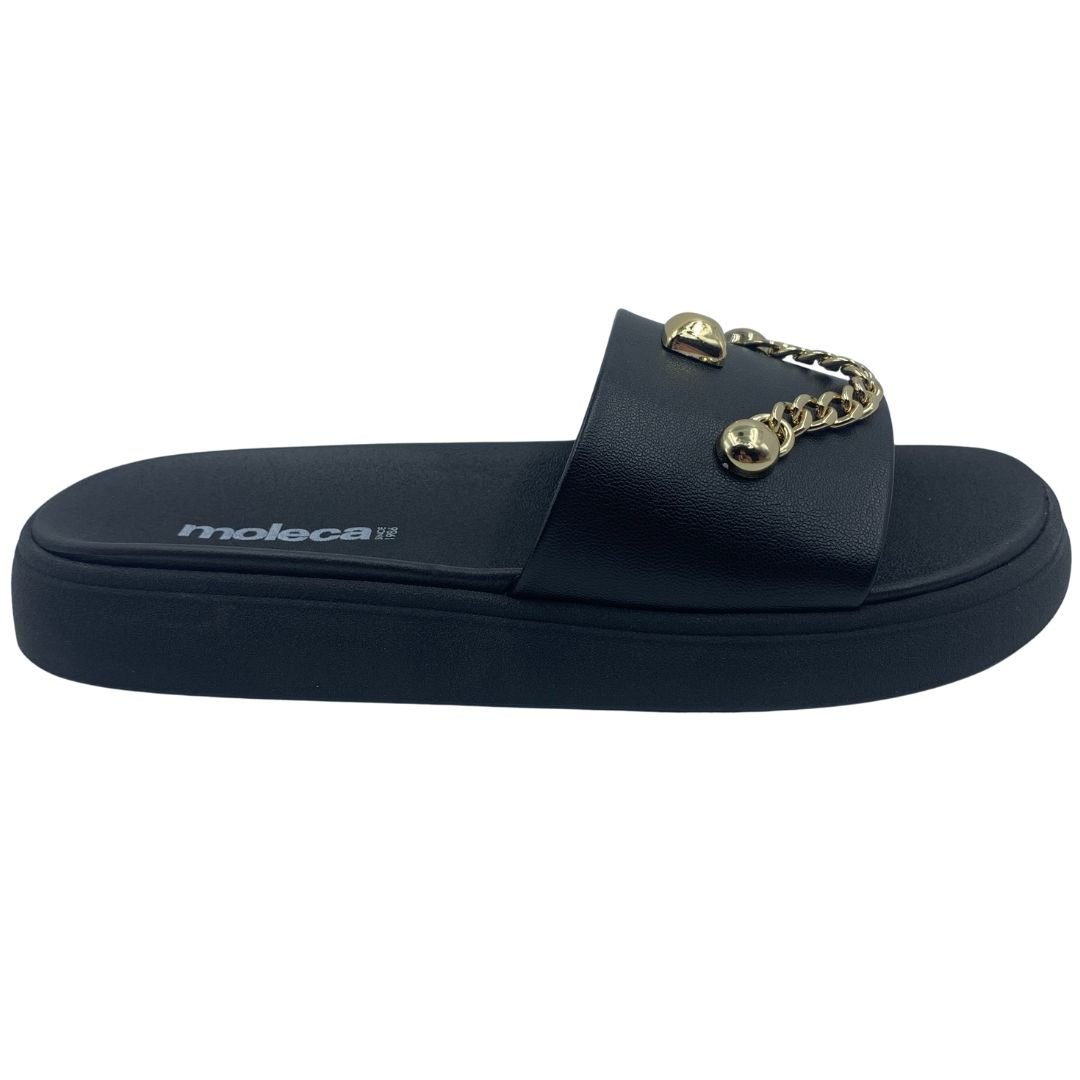 Tamanco Papete Slide Moleca com Corrente Preto 5469154. A tendência do verão que continua para as próximas estações, são as papetes. Modelo que além de versátil é confortável, com seu solado flatform e sua palmilha anatômica em EVA que proporciona conforto e amortecimento, além de deixar seu look super fashionista. Seu cabedal em napa sintética, possui detalhe em corrente que a deixam mais moderna e despojada, sua sola em borracha antiderrapante garante estabilidade no seu uso. Compre logo sua Papete Moleca, e arrase nesse verão.