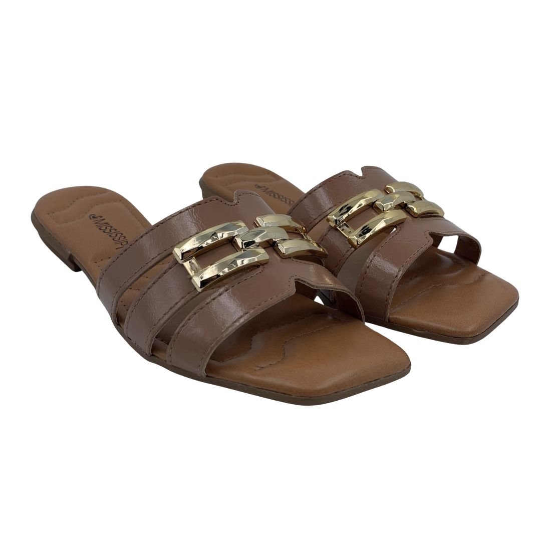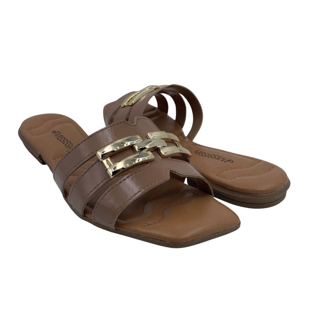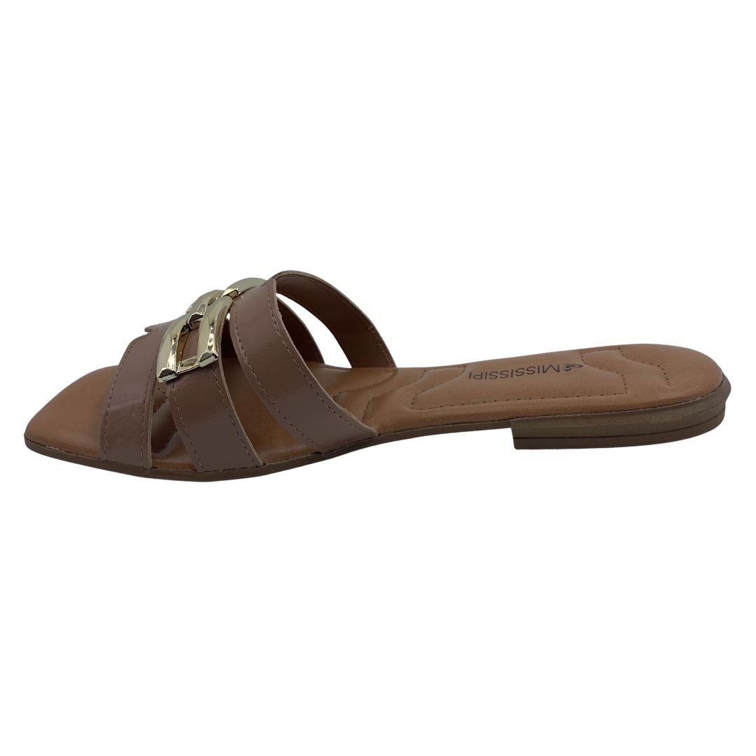 Tamanco Rasteira Mississipi com Enfeite Fivela Bege 693. As rasteiras são essenciais para os dias mais quentes, perfeitas para usar com vestidos, bermudas e saias, seu solado em borracha antiderrapante garante estabilidade e segurança a cada passo. Fabricada em napa sintética, possui um designer inovador, com detalhe metalizado dourado trazendo charme e elegância a rasteira, sua palmilha estofada traz conforto e maciez durante seu uso. Compre logo sua rasteira Mississipi, e arrase nesse verão.