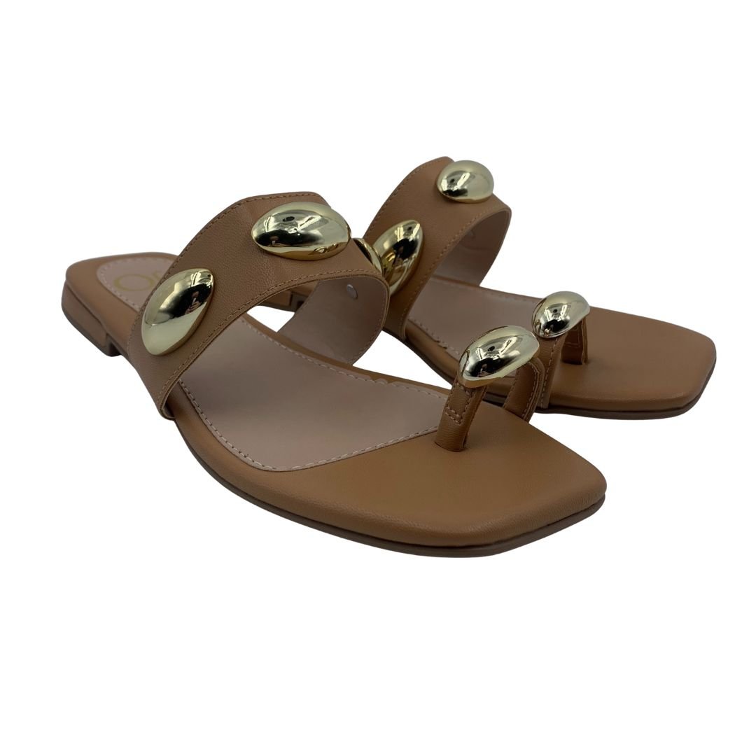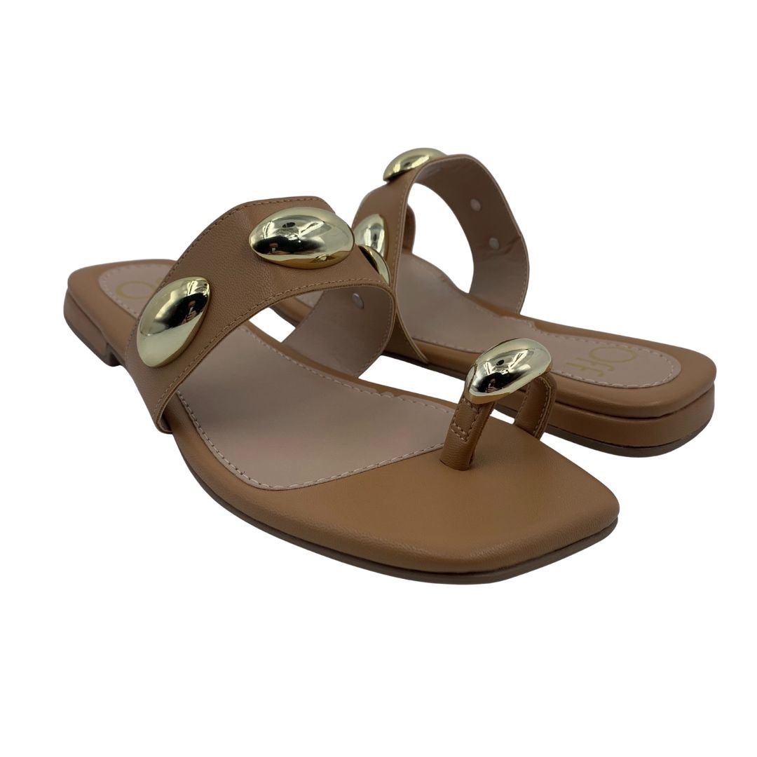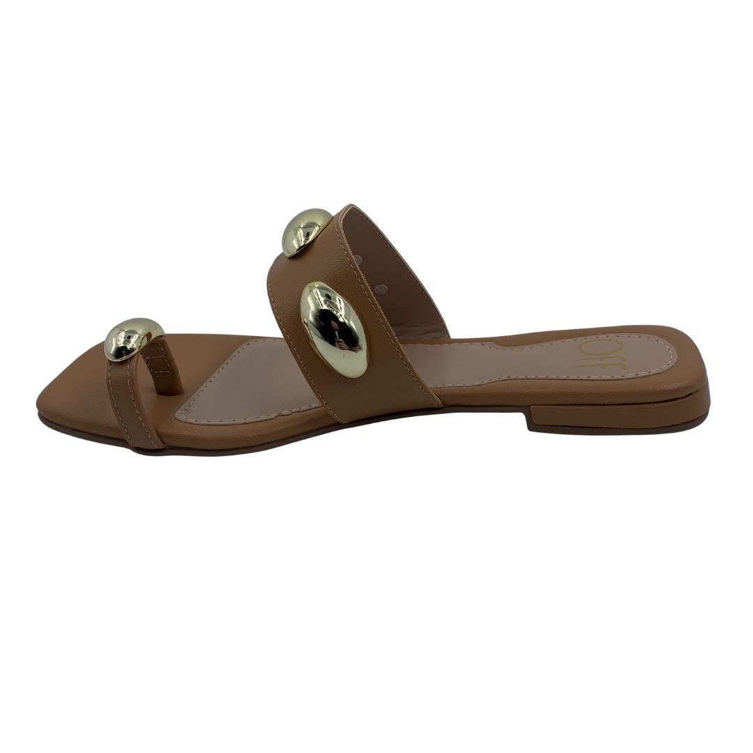 Tamanco Rasteira Offline com Enfeite Bege 24079. As rasteiras são essenciais para os dias mais quentes, perfeitas para usar com vestidos, bermudas e saias, seu solado em borracha antiderrapante garante estabilidade e segurança a cada passo. Fabricada em napa sintética, possui um designer inovador, com detalhe metalizado dourado trazendo charme e elegância a rasteira, sua palmilha estofada traz conforto e maciez durante seu uso. Modernidade para seus pés, você encontra nos calçados Offline, compre logo o seu!