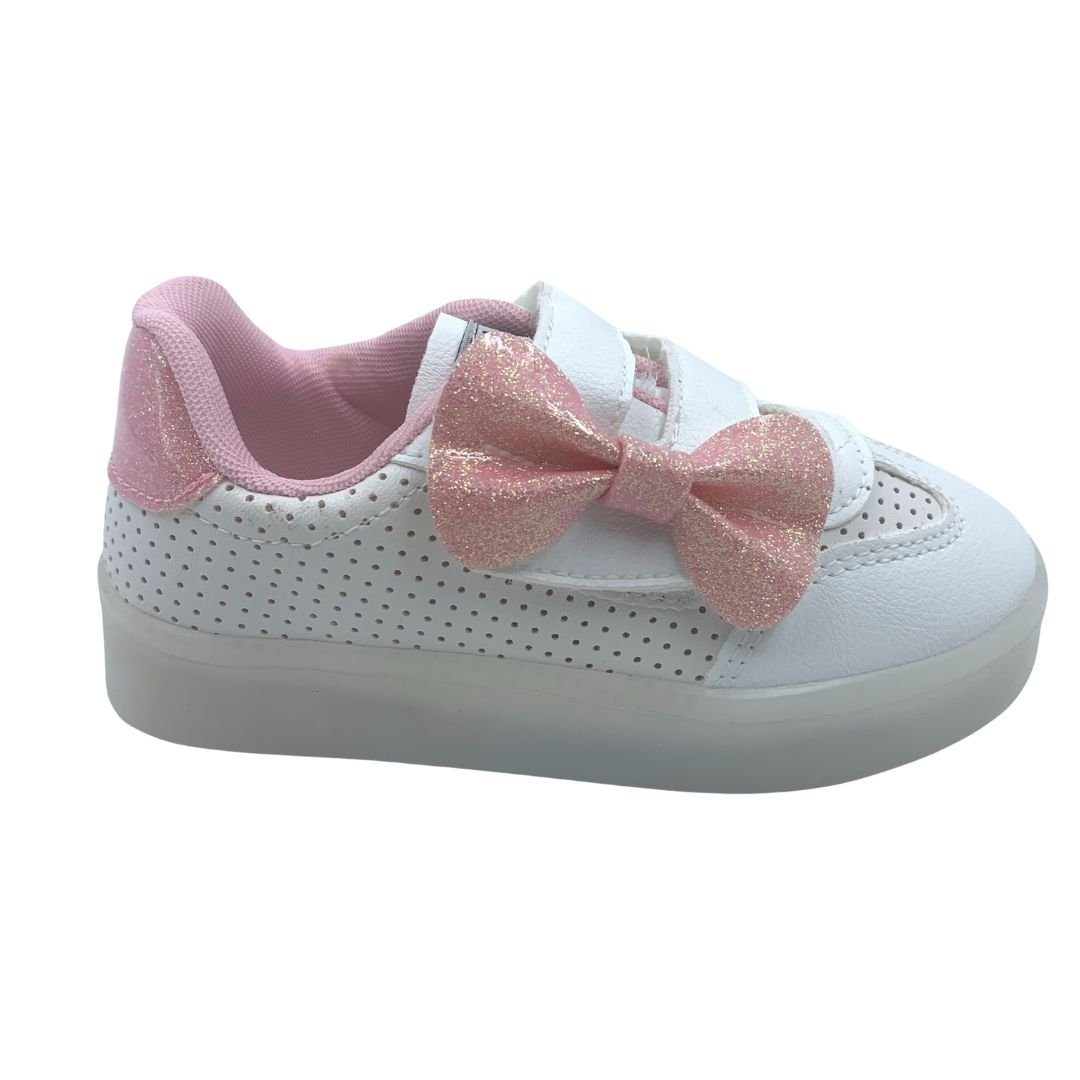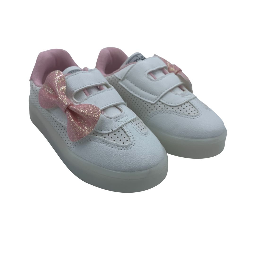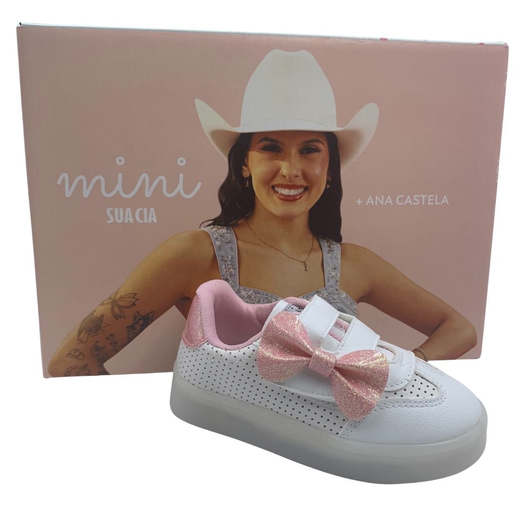 Tênis Bebê Pisca-Pisca Mini Sua Cia com Laço Branco 00730. Os tênis já são os queridinhos do universo feminino, e agora das meninas também, além de serem lindos são super confortáveis e combinam com qualquer look. Sua princesa vai amar esse tênis com luz de led colorida na sola, uma diversão a cada passo. Fabricado em napa sintética com detalhe rosa com brilho, que dá um toque de delicadeza ao modelo, seu fechamento em superfície alto colante com enfeite de laço rosa com brilho, facilita o dia a dia das mães. Deixe sua princesa estilosa com os calçados Mini Sua Cia, compre já, do conforto da sua casa!
