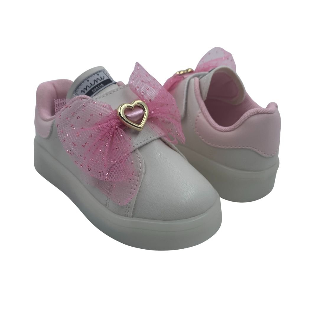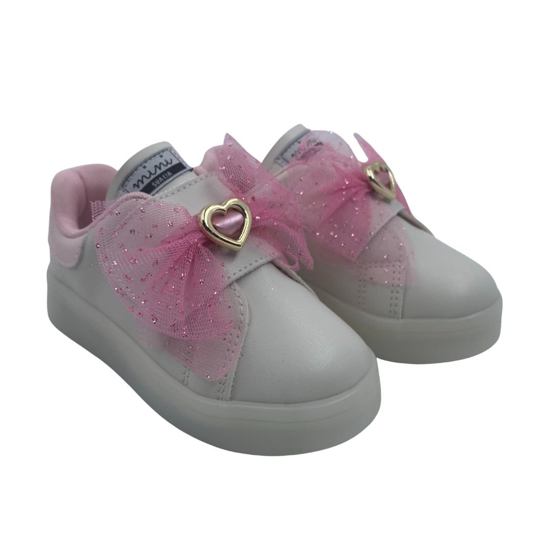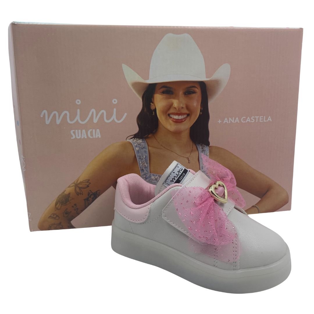Tênis Bebê Pisca-Pisca Mini Sua Cia com Laço Branco 00731. Os tênis já são os queridinhos do universo feminino, e agora das meninas também, além de serem lindos são super confortáveis e combinam com qualquer look. Sua princesa vai amar esse tênis com luz de led colorida na sola, uma diversão a cada passo. Fabricado em napa sintética com detalhe em laço rosa de tule com brilho com um pingente de coração dourado, que dá um toque de delicadeza ao modelo, seu fechamento em superfície alto colante, facilita o dia a dia das mães. Deixe sua princesa estilosa com os calçados Mini Sua Cia, compre já, do conforto da sua casa!