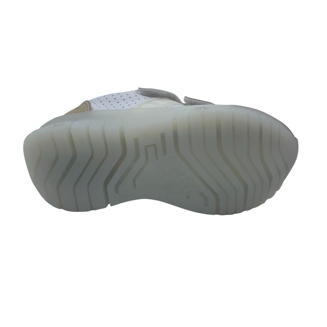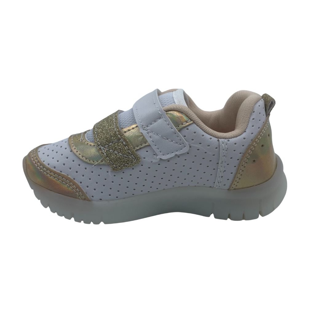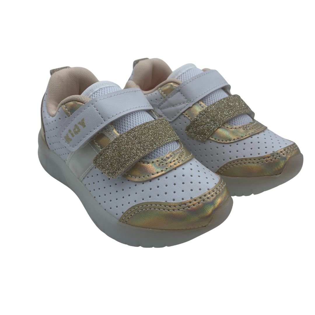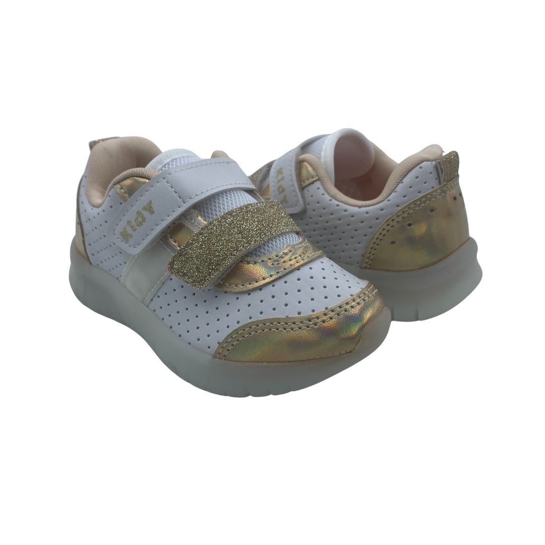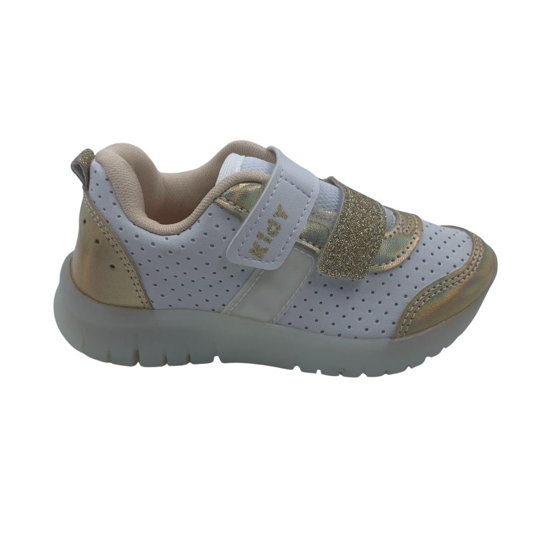 Tênis Menina Pisca-Pisca Led Kidy Branco com Dourado 351104. Escolher o tênis certo para o conforto do seu filho é essencial, pensando nisso a Kidy possui calçados Anatômicos, que ajudam na formação dos pés e conforto. Fabricado em napa sintética de qualidade trazendo durabilidade ao tênis, sua sola feita em borracha antiderrapante garante estabilidade à cada passo, possui Led na sola e no cabedal garantindo a diversão das meninas, com fechamento em superfície alto colante, trazendo mais autonomia. Kidy saúde e conforto para os pés das crianças, compre logo.