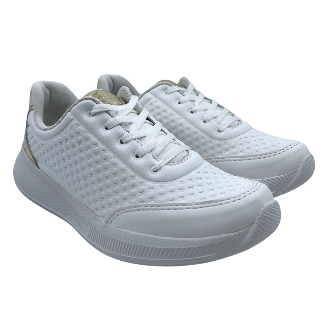 Tênis Mississipi Casual Feminino Branco com Dourado 941. Os tênis são os queridinhos do mundo da moda, cada vez trazendo mais irreverência e conforto para o dia a dia. Fabricado em napa sintética macia e de qualidade que se adapta aos mais variados formatos de pés, sua palmilha feita em espuma traz ainda mais conforto durante seu uso. Sua sola é feita em EVA garante amortecimento e conforto ao caminhar, seu fechamento em cadarço o torna mais despojado e descontraído, juntamente com seu detalhe em dourado. Perfeito para usar com vestidos, calças e bermudas, podendo ser usado no trabalho e em momentos de lazer. Mississipi mais conforto para seus dias, compre logo o seu!