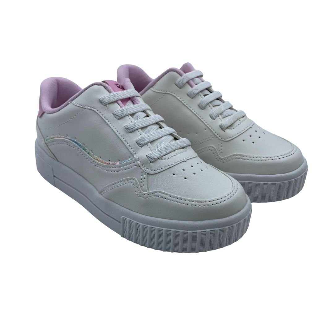 Tênis Pink Cats Casual Flatform Calce Fácil Branco 5152. Os tênis já são os queridinhos do universo feminino, e agora das meninas também, além de serem lindos são super confortáveis e combinam com qualquer look. Esse modelo com solado flat form, além de proporcionar conforto, ele deixa o look mais despojado e fashionista. Feito em nada sintética macia e de qualidade, proporcionando conforto e maciez no pé da sua pequena, seu calce fácil com cadarço em elástico traz autonomia para elas, seu detalhe em brilho no cabedal o deixa mais delicado. Pink Cats, seu jeito pink de ser.